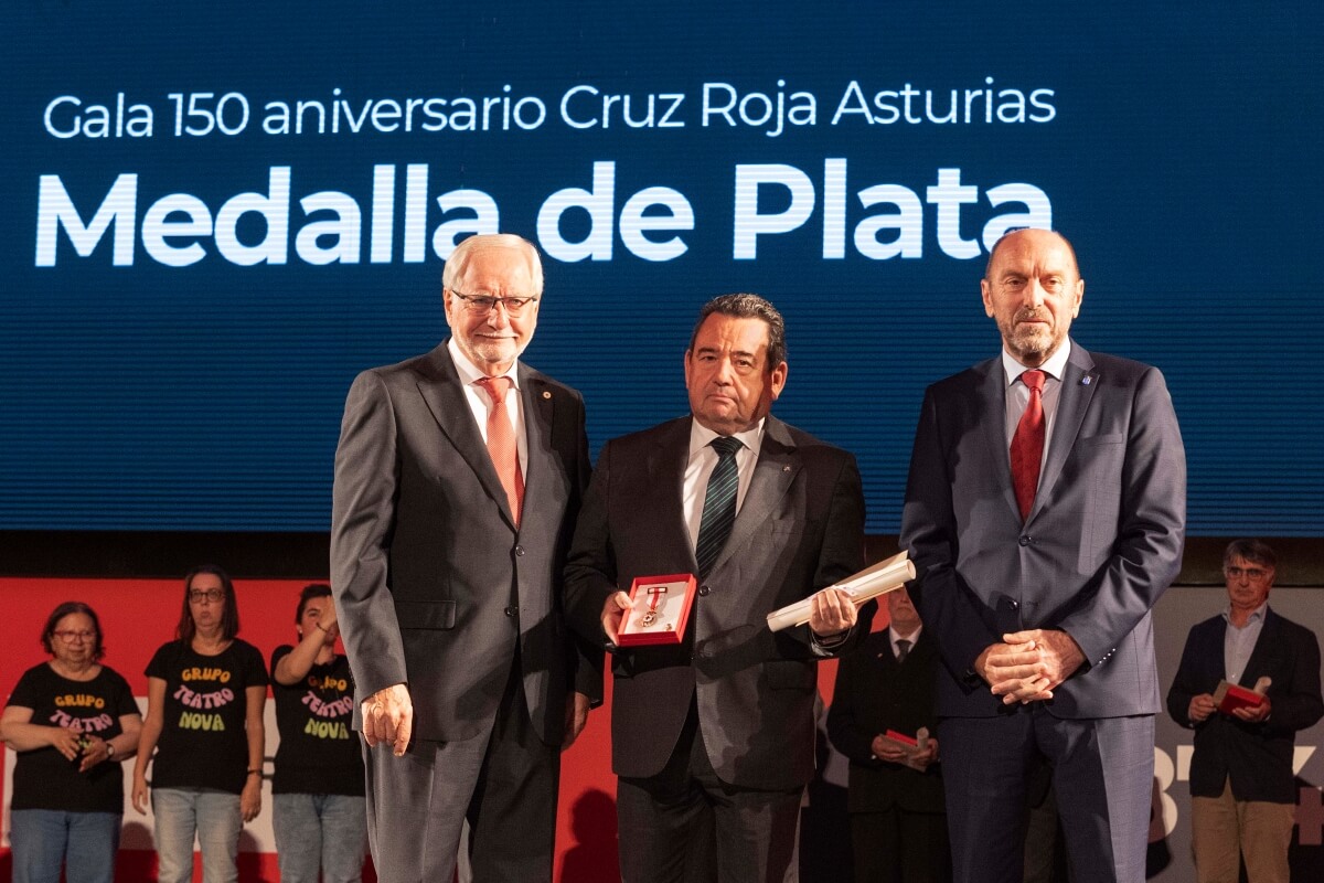 Ayer, Fernando Martínez, presidente de Caja Rural de Asturias, recogió la Medalla de Plata que Cruz Roja concedió a la entidad con motivo de su 150 aniversario en Asturias. José María Lana, presidente de Cruz Roja Asturias, y Juan Cofiño, presidente de la Junta General del Principado, fueron los encargados de hacer la entrega de este reconocimiento.
