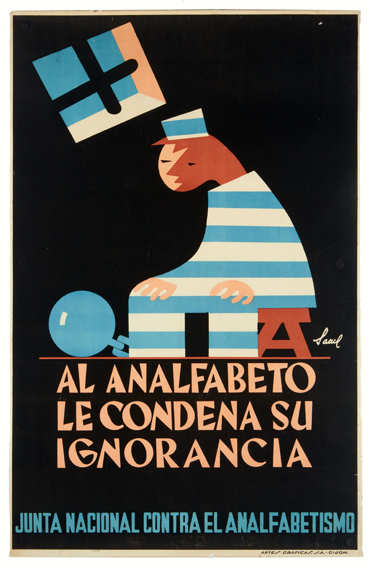 El otro cartel es de 1955 y fue editado para una campaña de propaganda de la Junta Nacional Contra el Analfabetismo, fundada en 1950. Está firmado por el ilustrador y cartelista madrileño Sacul (seudónimo de Miguel Lucas San Mateo) y se hizo en la litografía Artes Gráficas, de Gijón / Xixón. Mide 99 x 63 cm y su estado de conservación es perfecto. Es un ejemplo de la calidad del trabajo de esta empresa litográfica gijonesa y de su prestigio a nivel nacional.