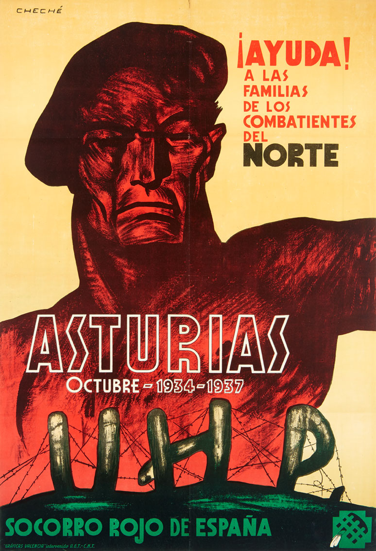 El más antiguo es de 1937 y fue realizado por Cheché (seudónimo de Juan José Moreno Llebra, Valladolid, 1900 – Madrid, 1954) en Valencia. Lo editó Socorro Rojo de España durante la Guerra Civil para pedir «ayuda a las familias de los combatientes del norte” y recordando el aniversario de la Revolución de Octubre de 1934 en Asturias; es un cartel de gran tamaño (100 x 67,5 cm) y está perfectamente conservado.